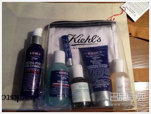 袋子里的是Kiehl's契尔氏男士全效保湿面部旅行套装/5件套,里面是男士全效磨砂膏75ml 、男士全效保湿乳75ml、男士全效护唇膏4.4g、小黄瓜水40ml、米麦蛋白丰盈洗发精30ml,老公以后出差不用东拼西凑的灌小瓶子了。袋子外面那 个是 极限男性緊膚精华75ML,购于香港机场,套装好像是RMB320,精华RMB220。