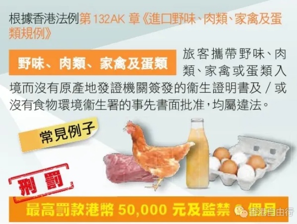根据《进口野味、肉类、家禽及蛋类规例》(第132AK章),凡任何人携带野味、肉类、家禽或蛋类入境而没有来源地发证实体签发的卫生证明书及/或没有食环署的事先书面批准,均属违法。违例者一经定罪,可被罚款港币五万元及监禁六个月。