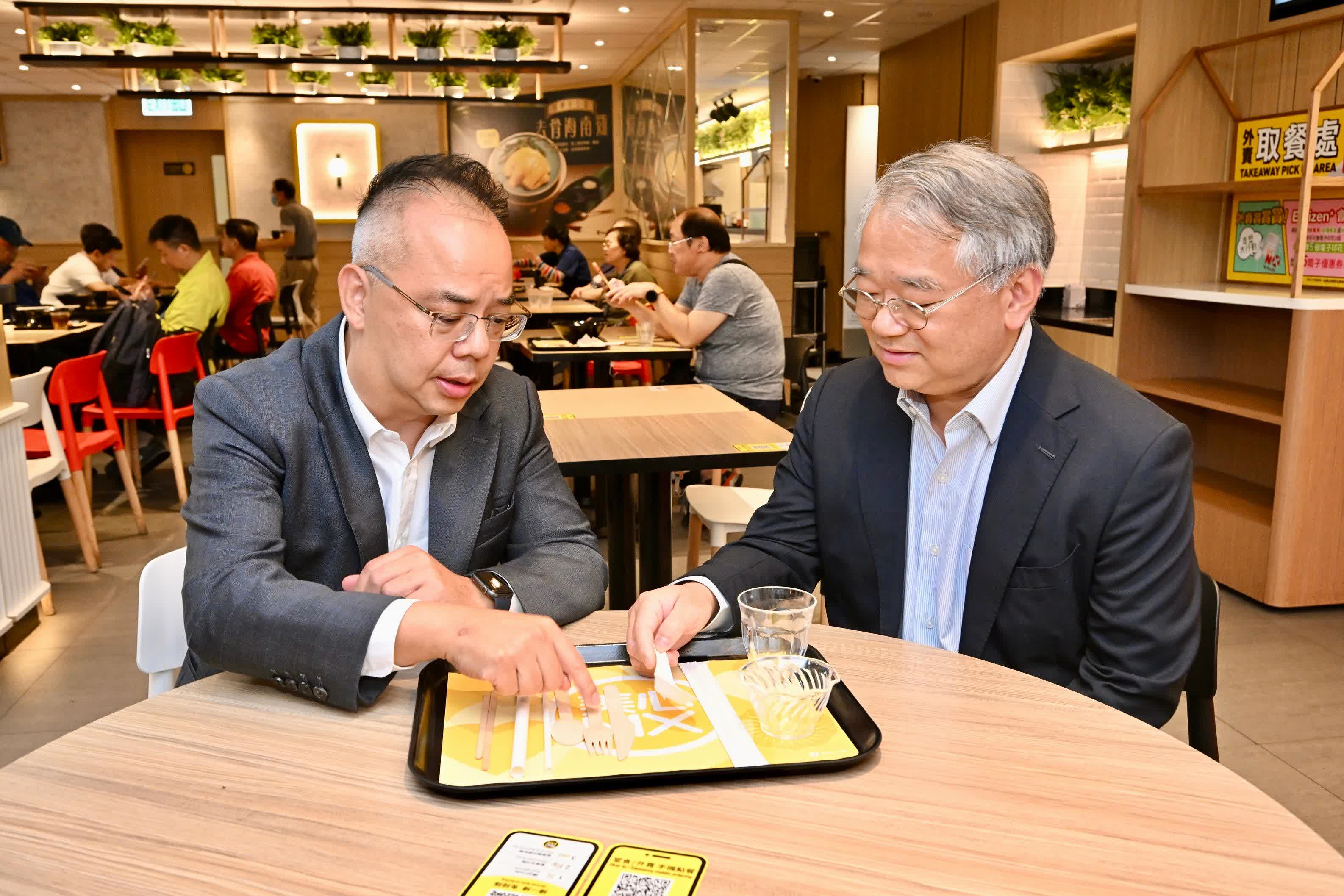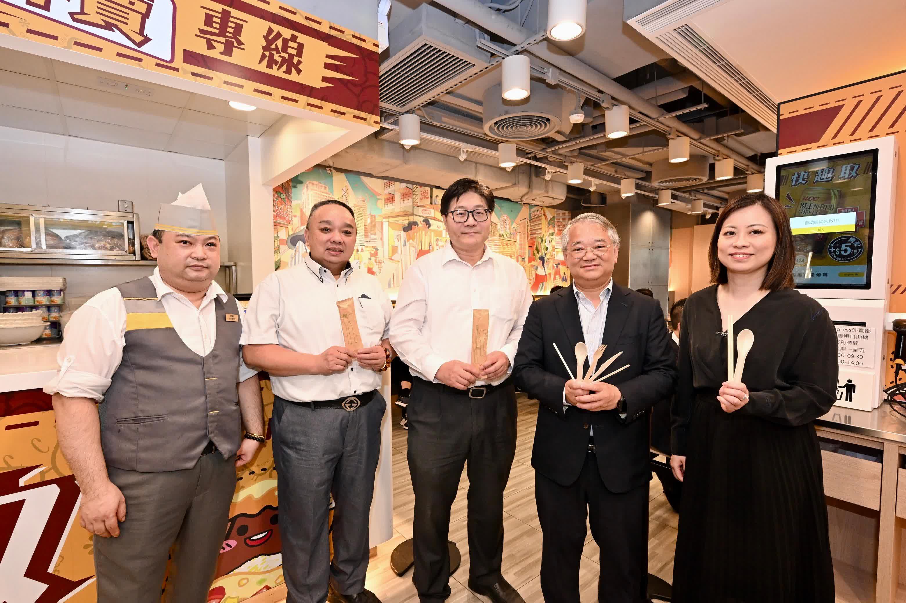 徐浩光博士与餐厅负责人和前线员工倾谈,了解餐厅集团就新法例实施的准备工作、餐厅提供的替代品餐具款式、供应情况和顾客的反应,以及餐厅的其他「走塑」措施。