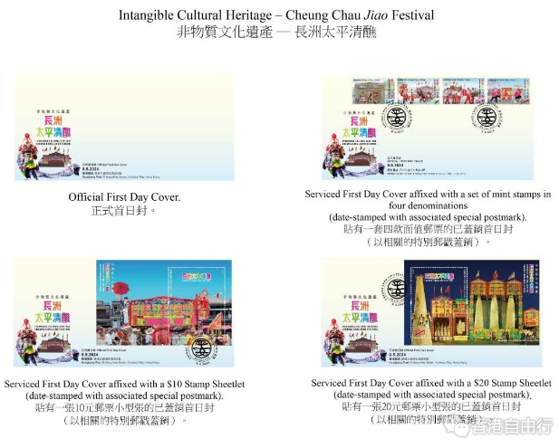全线邮政局和网上购物坊「邮购网」由4月24日(星期三)起发售「非物质文化遗产—长洲太平清醮」正式首日封。这套特别邮票及相关邮品将于5月9日起在各邮政局及「邮购网」发售,而贴有特别邮票的已盖销首日封只限在集邮局发售。