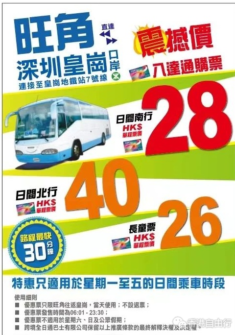 据介绍,巴士直达皇岗口岸,连结皇岗地铁7号线。旺角线日间时段不经过吐露港公路及尖山隧道,只走最便捷的大榄隧道,省时省钱省力,车程仅35分钟左右。该优惠只适用于星期一至星期五日间乘车时间段(6:01-23:30),不适用于周末及公众假期。