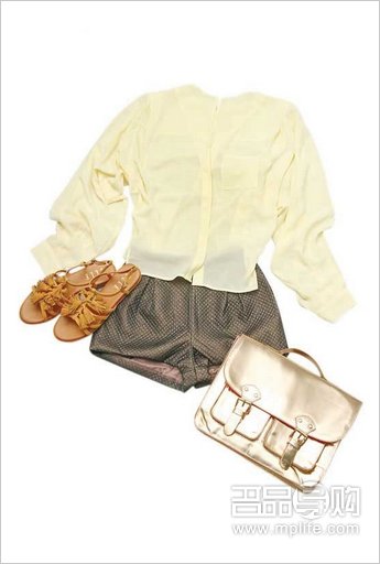 H & M黄色恤衫 $349(d)、H & M铜色短裤 $399(d)、H & M金色Satchel书包 $249(d)、ELLE黄色穗饰平底凉鞋 $799(b)