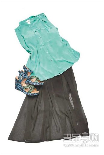 H & M绿色背心 $299(d)、H & M黑色长裙 $399(d)、Millie's蓝×绿色豹纹图案船踭鞋$899(b)