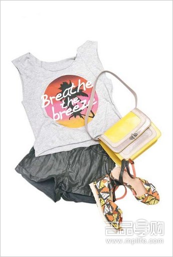 Monki灰色图案背心 $120(c) 、H & M黑色仿皮短裤 $199(c) 、Millie's彩色几何图案船踭鞋 $998(b)