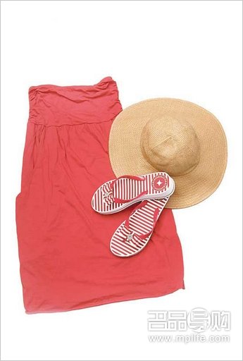 Monki阔边草帽 $150(c)、Velvet红色露肩连身短裙 $1,200(a)、BCBG红白色条子人字拖 $799(b)
