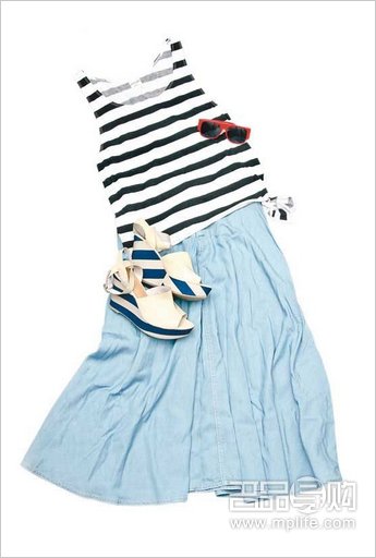 Monki蓝×白色横间背心 $100(c)、Graham and Spencer浅蓝色牛仔裙裤 未定价(a)、Millie's条子船踭鞋 $1,090(b)
