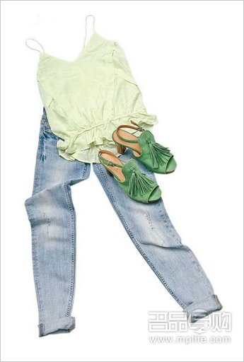 H & M荧光绿色吊带背心 $299(d)、H & M洗水牛仔裤 $1,290(d)、Millie's绿色穗饰高踭鞋 $1,290(b)