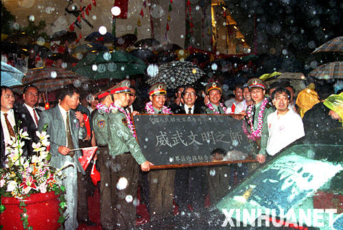 1997年7月1日清晨,中国人民解放军驻香港部队进入香港,受到香港市民的热烈欢迎。新界区各界代表向驻香港部队赠匾,赞解放军为“威武文明之师”。 新华社发