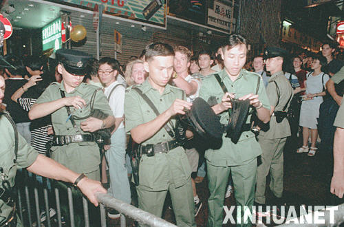 1997年6月30日午夜,香港警察更换带有紫荆花图案的新警徽。 新华社发