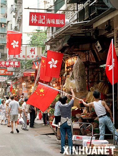 回归前夕,香港大街小巷纷纷挂起中国国旗和香港特区区旗,人们以迫切的心情期盼着回归时刻的来临。 新华社发