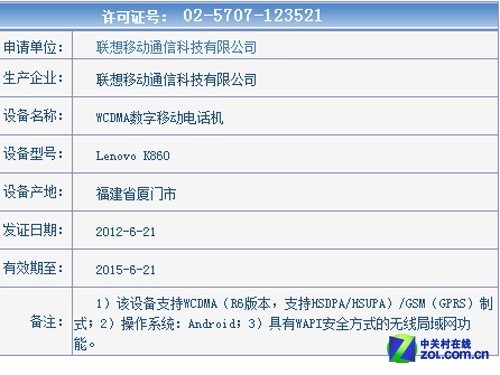 此前刚被国外一博客曝光联想最新产品联想 乐Phone K860的图片以及配置参数。现在小编又从国家工信部的网站上查到,现在这款机子已经取得了入网许可证,许可证号为:02-5707-123521。发证日期为6月21日。已取得入网许可证都有十天了,联想还未公布其这款机子的配置的信息。看来联想是想在上市时给大家一个惊喜。