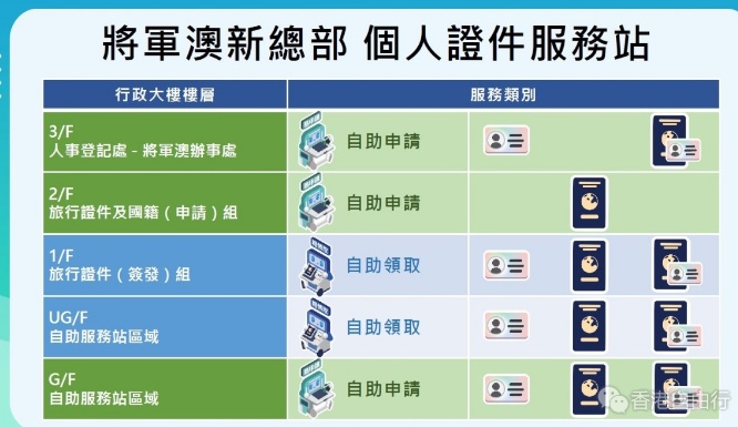 至于领证方面,入境处已整合各种领取证件服务站的功能,合资格的市民可以透过同样位于入境处总部的「领取个人证件服务站」,以自助形式同时领取身份证和特区护照。