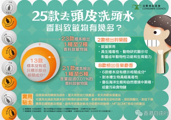 测试亦发现,10款洗头水样本验出另一种活性成份水杨酸,其中1款的浓度达1.9%,绝大部分没有根据欧盟规定标示「三岁以上儿童勿用」的警告。另外,超过9成样本含有香料致敏物,当中两款含有欧盟禁用、具生殖毒性的香料铃兰醛。8款样本检出对水栖生物有高度毒性的佳乐麝香。