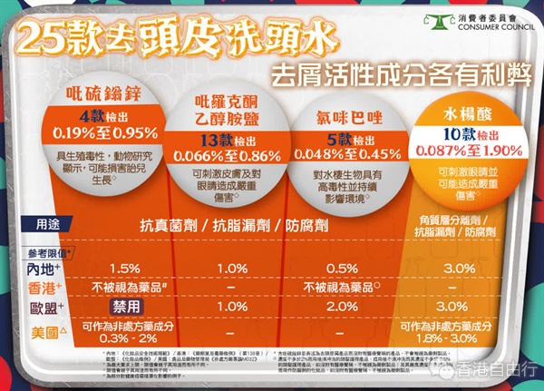 消委会测试市面25款去头皮洗头水,发现其中4款含欧盟禁用成份「吡硫鎓锌」,有动物研究显示这种成份可能会损害胎儿成长,亦有研究指出,可引起接触性皮肤炎,但在美国视为准用的非处方药用成份。该4款洗头水的「吡硫鎓锌」介乎0.19%至0.95%,含量符合内地相关规定。