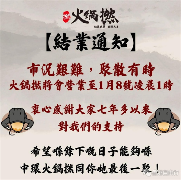「火锅捻」在社交平台发布结业通知,指市况艰难,聚散有时。中环店将会营业至本月8日凌晨1时,店方衷心感谢顾客在7年多以来的支持,希望在馀下的日子能够在中环店与大家最后一聚。