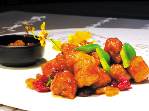 祗月完整地保留了当铺的水墨外墙。在内部,随处可见木楼梯、当铺招牌、算盘等古迹古物,辅以灯光、纱幔的装饰,甚有怀旧的气氛。据说,在这里吃饭,往往需要提早数周预约。这次,我们共吃了东坡荔枝、京果陈醋咕噜肉、芝士墨鱼球、三丝素春卷、碧绿蟹子饺、玫瑰参蜜糕等十多样,甚是可口。