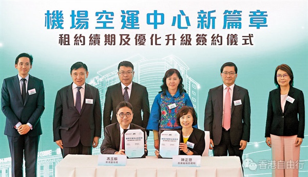在特区政府运输及物流局局长陈美宝、中央政府驻港联络办经济部副部长吕峰、机管局主席林天福、郭炳联、机管局署理行政总裁张李佳蕙和新地执行董事郭基泓见证下,新地执行董事冯玉麟和机管局商务执行总监陈正思昨代表双方签署新租约。