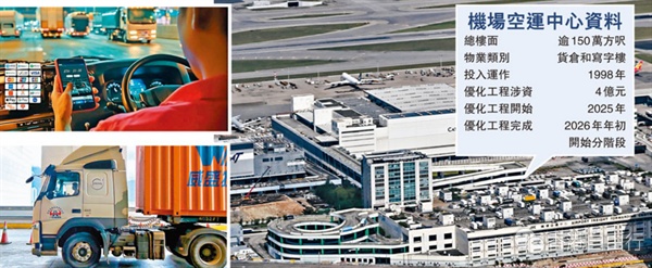 继三跑道系统去年11月底正式启用后,香港国际机场的设施又迎来升级,进一步巩固本港的国际航空枢纽地位。新鸿基地产旗下总楼面逾150万方迟的机场空运中心昨日与香港机管局达成协议,于2028年经营权与租约到期后,确定会续租15年至2043年。新地主席兼董事总经理郭炳联表示,将斥资4亿元为该中心进行全面的升级工程,包括改进仓库灵活布局方便中小企租客、引入智能数码化管理系统及绿色建筑等。而升级工程已于今年展开,预计明年年初开始分阶段落成,整体货运吞吐量预计可提高达30%。