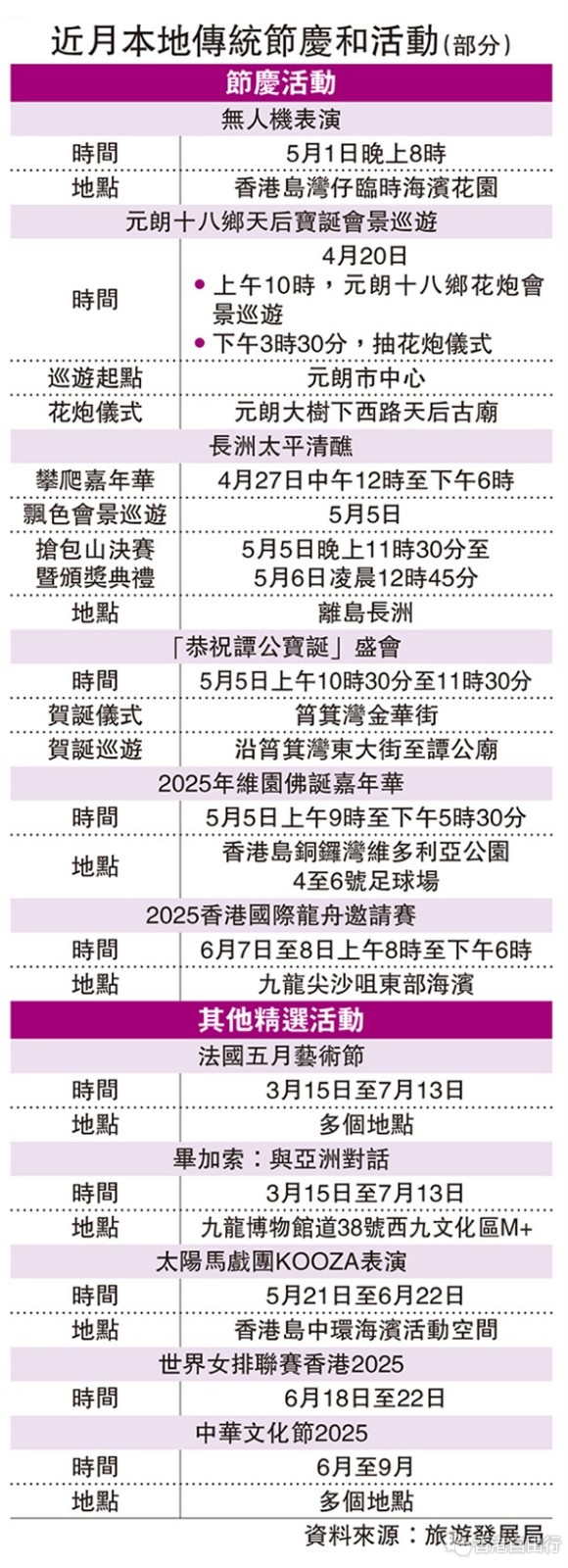 旅发局将于5月1日晚上在湾仔临时海滨花园举行以三大非遗节庆,即天后诞、谭公诞及长洲太平清醮为主题的无人机表演。旅发局亦会在6月举办「香港国际龙舟邀请赛」,除了海上比赛外,岸上亦有日夜美食打卡热闹节目。