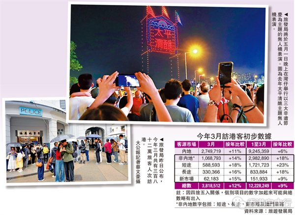 根据最新入境旅客数据,今年3月共有382万旅客人次访港,按年升12%,而今年首季约1220万访港旅客人次中,内地旅客佔925万人次,非内地旅客人次为298万,分别按年多6%及18%。旅发局表示,非内地市场旅客量于首季平稳增长,短途市场以日本、韩国及台湾表现较佳,首季客量按年增幅各达30%或以上;长途市场方面,首季来自美国和加拿大的旅客按年录得双位数增幅,澳洲则于长途市场中表现更佳,按年增长32%。