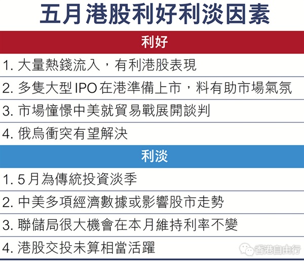 要推断资金流入会否有利港股,始终要看外国长期基金会否继续增持港股。短线而言,内地再传蚂蚁的海外业务将独立上市,加上蚂蚁出手收购耀才(1428),使得阿里系再有炒作,气氛上有助恒指挑战22,800至23,000点水平。但踏入5月中下旬,内地多项与进出口及投资、消费相关的数据将会出台,数据将反映中美贸易停止后的影响,而美国关税后遗症在5月中旬后会更明显,这都可能成为港股反弹后转向的转折点。