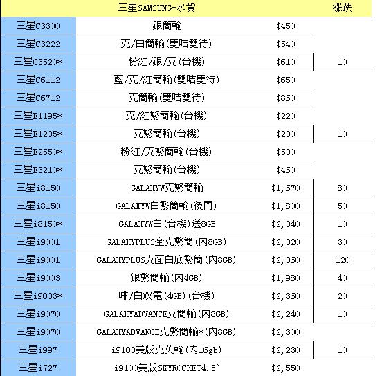 上周的三星手机整体小降之后,本周持续了这种势头,尽管没有特别抢眼的表现,不过细看性价比不错的型号,的确有吸引力。前热门中端机型i8150本周有80港元的下降,目前报价1670港元,折合人民币仅约1370元,性价比较高。还有持续热门的i9100,个款式都有几十港元不等的下降,依旧讨好大众朋友。至于最新的i9300,本周报价4500港元,还是站在高位,喜欢而又嫌价高的朋友不妨等等。