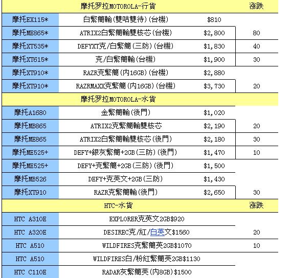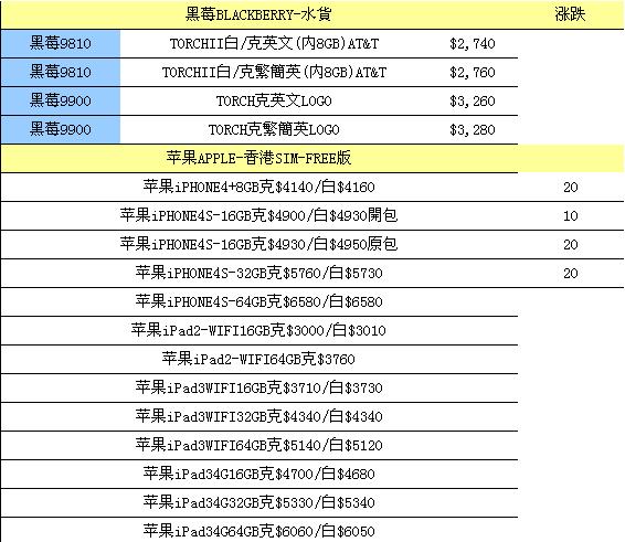 2012年7月7日香港手机报价:先达作为香港的水货手机圣地,同时也销售港行和后行,后行是指撕了保修标签的行货,花100元左右买一个标签贴上去就和行货无异了,而且能得到保修。我们为各位提供的是先达商家拿货的上层报价单,而这份报价单来自先达批货上层,可以说整个中国大陆从香港拿的货价格和这个报价单差异不大,绝对权威。