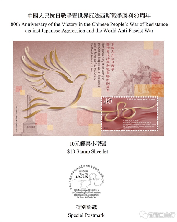 香港邮政今日(26日)宣布,以「中国人民抗日战争暨世界反法西斯战争胜利80周年」为题发行邮票小型张及相关邮品,将于下月3日(星期三)推出发售。