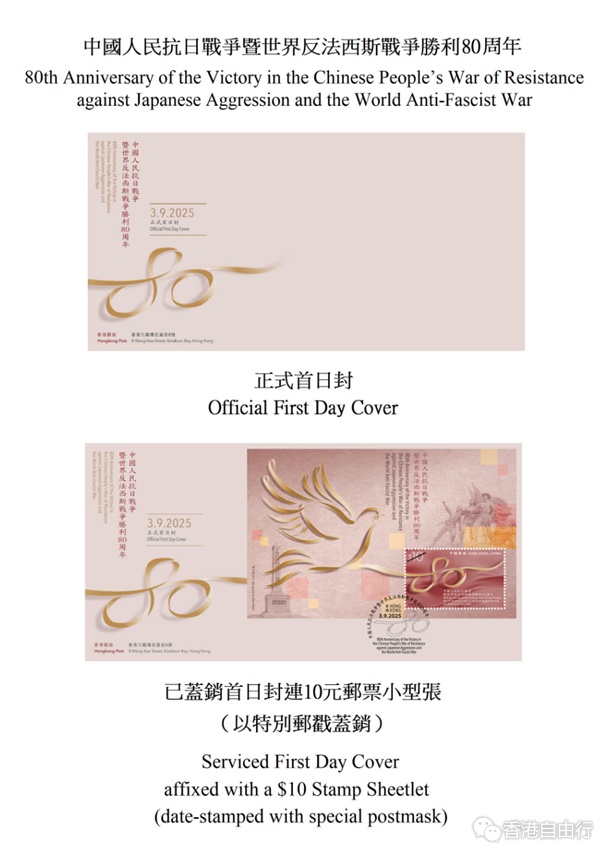 全线邮政局和香港邮政网上购物坊「邮购网」(shopthrupost.hongkongpost.hk)由明日(27日)起,发售「中国人民抗日战争暨世界反法西斯战争胜利80周年」正式首日封。邮票小型张及相关邮品,将于9月3日起在各邮政局及「邮购网」发售,而贴有邮票小型张的已盖销首日封,只限在集邮局发售。各邮政局将于9月3日为所有正式首日封/纪念封/注明首日字样和本地地址的自製封,提供即时人手盖印服务。