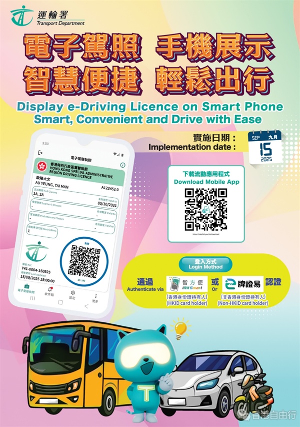 经立法会通过的《2025年道路交通(修订)条例》今日生效。政府今日刊宪指明电子驾照的平台和格式。驾照持有人可参阅运输署专题网页及Agent T Facebook专页了解详情。