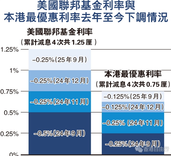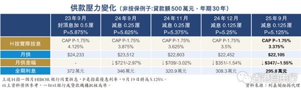 美联储周四(18日)凌晨宣布减息0.25厘,香港三大发钞行滙丰、中银及渣打昨日下调与楼按相关的最优惠利率(P)0.125厘,这是港银时隔9个月来再度减息。假设贷款500万元、年期30年,减息后每月供款减少347元。近年楼市经历由加息到减息的阶段,目前入市成本经已大减,以上述500万元贷款为例,2023年入市时全期利息共372万元,去到今次减息后的入市全期利息支出降至295.8万元,节省足足逾76万元。金管局总裁余伟文昨表示,利率下调会减轻个人及企业的债务负担,对经济及楼市有一定正面影响。
