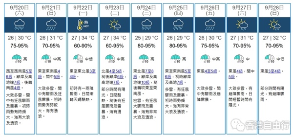 下周四(25日)风势稍缓,吹东至东南风5至6级,初时离岸及高地达7级,仍多云有狂风骤雨及雷暴,雨势初时颇大,海面继续有非常大浪及涌浪。预计下周五(26日)起天气逐渐好转,风力减弱,骤雨减少。周末期间短暂时间有阳光,气温回升,最高可达32度。