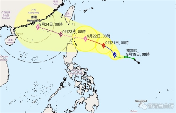 「桦加沙」预料于下周二(23日)早上进入香港东南约600公里范围,并达至超强颱风级别,风速高达每小时195公里。之后它将维持西北偏北路径,趋向珠江口,当晚进入本港东南约400公里,仍维持超强颱风强度。