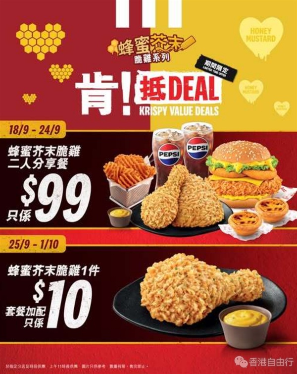 KFC推出新一轮「肯!抵DEAL」优惠,今日(18日)至9月24日期间,上午11点后蜂蜜芥末脆鸡二人分享餐$99。