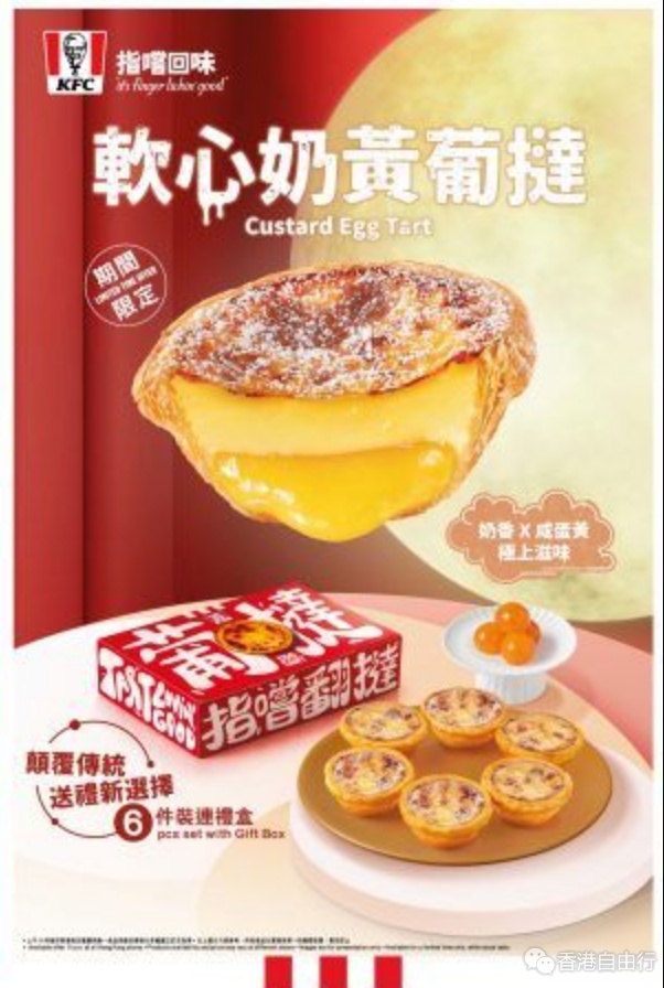 另外,过中秋节想有些新意?KFC全新限定「软心奶黄葡挞」更配以6件礼盒装登场,这款葡挞是中秋团圆的完美甜点选择,为您的祝福增添温暖与甜美。