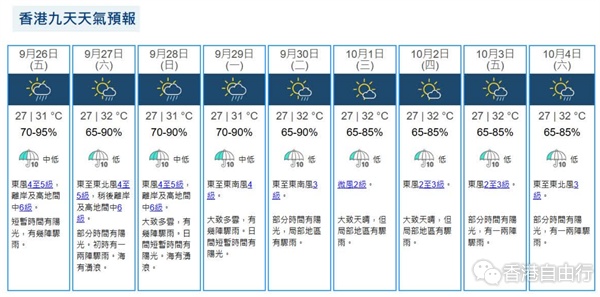 展望本港未来两三日短暂时间有阳光,有几阵骤雨。星期六(27日)部分时间有阳光,初时有一两阵骤雨,海有涌浪,气温介乎27至32度。星期日(28日)大致多云,有几阵骤雨,日间短暂时间有阳光,海有涌浪,气温介乎27至31度。下周中期渐转天晴。