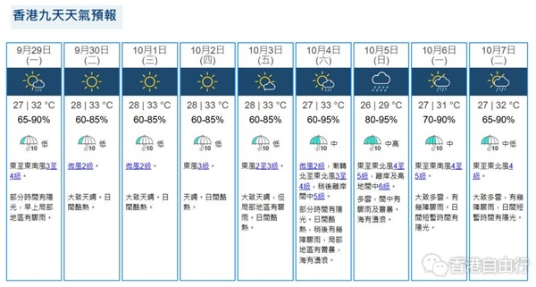 展望本港未来两三日大致天晴及酷热。星期二(30日)天气大致天晴,日间酷热,气温介乎28至33度。星期三(10月1日)天气大致天晴,日间酷热,气温介乎28至33度。