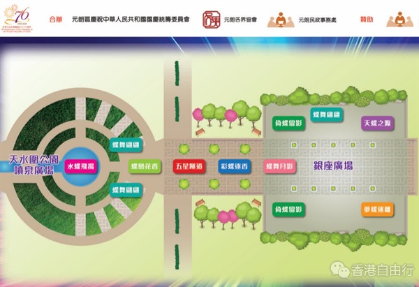 为迎来国庆七十六周年,并适逢中秋佳节将至,元朗民政事务处联同元朗区庆祝中华人民共和国国庆统筹委员会及元朗各界协会将于本年10月1日(星期三)起,一连七天,在天水围公园及银座广场举办《元朗区日夜都缤纷@天水‧光影》。活动透过璀璨夺目的光影灯饰及五光十色的大型户外装置,打造成以「蝴蝶」为主题的别具特色打卡点,以增添节庆气氛。