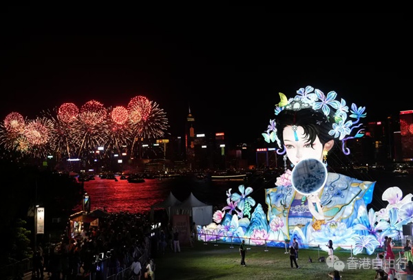 沿维港岸边漫步,最醒目的莫过于「香江仙子」花灯组。主灯「紫霞仙子」高12.8米,由四川自贡花灯匠人历时半年打造,是香港迄今展出过的最大单体人物花灯。以紫荆花为灵感,裙裾间点缀牡丹与锦绣,寓意国泰民安、花开富贵。亮灯后,花灯前很快聚满人群,不少市民和游客拍照留念,成为现场最受欢迎的打卡点。与之相映的「国色凝香」「锦裳荷影」「芙韵江山」等主题灯景,将花神文化、节气意象与江山图景融为一体,为国庆夜色增添浪漫气息。