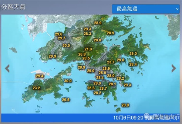 今日早上9时许,天文台录得气温28.4度、元朗公园30.5度、上水29度、西贡29.0度、大埔督28.9度。相对湿度84%。过去一小时,京士柏录得的平均紫外线指数是1,强度属于低。