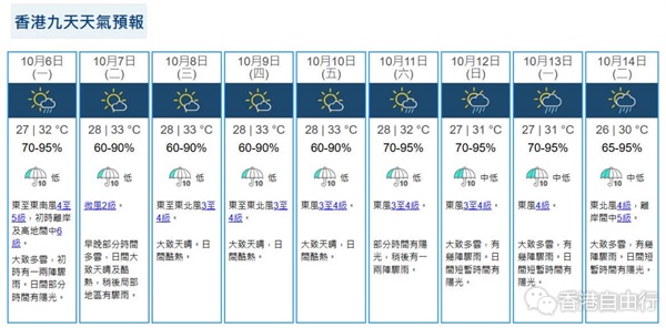 展望本港未来数日大致天晴,持续酷热。明日追月日红日假期(7日)早晚部分时间多云,日间大致天晴及酷热,稍后局部地区有骤雨,气温介乎28至33度。星期三(8日)大致天晴,日间酷热,气温介乎28至33度。