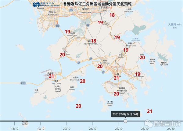 下周四(23日)是廿四节气中的「霜降」,即是秋天最后一个节气,指天气渐冷,大地开始产生霜了。天文台预料下周日(19日)本港气温开始下降,介乎27至33度;下周一(20日)气温跌穿30度,降至24至29度;至下周二(21日)气温进一步降至22至26度;料「霜降」前的周三(22日)及「霜降」当日,市区气温会降至最低21度。自动分区天气预报显示,下周三清晨新界多区跌穿20度,流浮山、上水、大埔、沙田及将军澳只有19度,石岗及打鼓岭更低见18度。