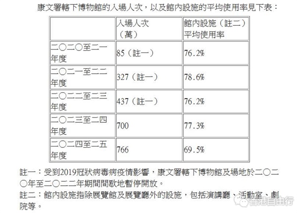 在过去五年,康文署辖下博物馆的入场人次由疫期间的85万人次,已大幅回升至疫后去年的766万人次,而馆内设施的平均使用率逾75%,详见下表。