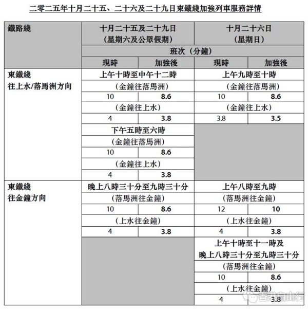 东铁綫将会于本周六、周日及下周三重阳节的上午及晚间部分时段行驶更频密的班次,南行及北行班次均会加密,便利沿綫居民出行,以及方便市民及旅客使用跨境段服务往返两地。(详见下表)