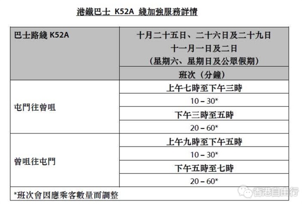 而来往屯马綫屯门站及曾咀灵灰安置所的港铁巴士K52A 綫,于即起至11月9日期间的周末加强服务及延长服务时间,未来两个周末(25及26日、11月1及2日)及重阳节当天将进一步加密班次。(详情下表)