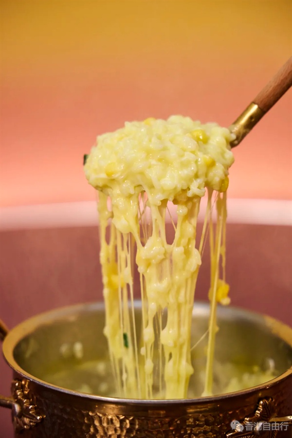 重头戏在于用剩余的玉米牛乳汤底制作「牵丝起司刷刷锅粥」或王子面/乌龙面。