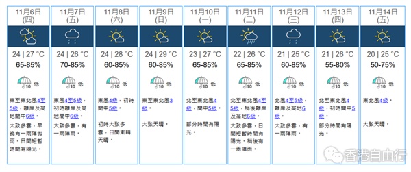 天文台补充,「无论如何」下周中期广东沿岸风势颇大,天气较凉。根据天文台最新九天天气预报,本港自下周起天气转凉,至下周三及周四(11月12日及13日)最低气温21度,到周五(11月14日)更低见20度。