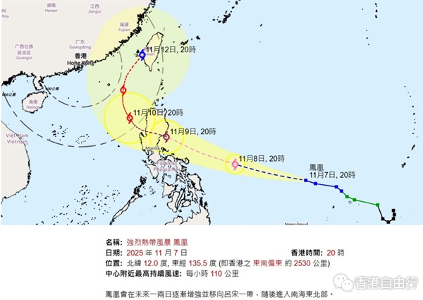 香港天文台今日(7日)晚上指,强烈热带风暴「凤凰」 会在下週初进入南海东北部,但会受乾燥的东北季候风影响而减弱,预料「凤凰」 有较大机会受高空西风槽引导,大致移向台湾一带。在东北季候风及「凤凰」 的共同效应下,本港下週初至中期风势颇大,水位亦会较正常稍高。天文台届时会视乎「凤凰」 与东北季候风的相互作用以及本地风力变化,考虑是否需要发出热带气旋警告信号或强烈季候风信号。
