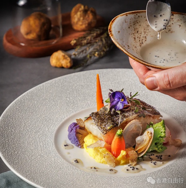 海鲜迷不容错过焗智利鲈鱼、炒蚬肉、薯蓉、白松露鱼子酱汁。智利海鲈鱼与白松露的香气相得益彰,Andrea更加入以鱼汤特制的白松露鱼子酱汁,为菜肴注入海洋的鲜甜滋味。