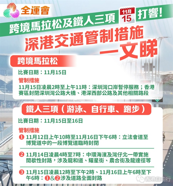 运输署呼吁留意全运会部分赛事的特别交通运输安排。第十五届全国运动会马拉松比赛将于本周六(15日)举行,铁人三项项目将于本周六及周日(11月15及16日)举行。为配合比赛,本周六,深圳湾口岸通关服务(包括客运及货车通关服务)将有特别安排;本周六及周日,中环及湾仔北一带(包括博览道、龙和道、耀星街、龙合街和龙达径)会实施封路及临时交通改道,受影响的驾驶者需改经菲林明道、干诺道中、夏慤道或告士打道。